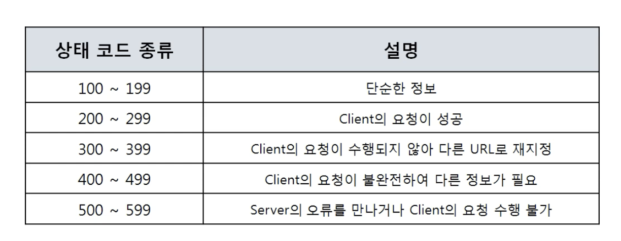 - 404: 클라이언트가 서버에 없는 페이지를 요청했을 때 (상태문구: Not Found)